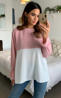 Wholesale 🥰 HOXTON GAL Long Sleeve Relaxed Fit Block Crepe Top With Necklace In Pink And White 🔔