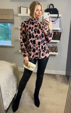 Best reviews of ✔️ KURT MULLER Giraffe Print Pleated High Neck Blouse In Pink ⌛