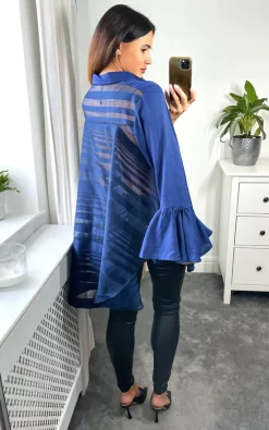 Outlet 🔥 CY Boutique Oversized 👕 Shirt With Frill Sleeves & Mesh Check Detail In Blue 🌟