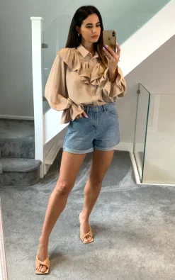 Top 10 🛒 HOXTON GAL Oversized Frilled Front 👚 Shirt With Detailed Cuffs In Beige ❤️