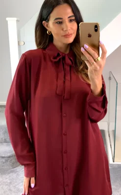 Wholesale ⭐ HOXTON GAL Oversized Tie Detailed Tunic 👚 Shirt With Long Sleeves In Burgundy 🔔