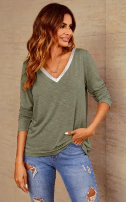 Discount 🔔 FS Collection Long Sleeves Silver Trim Simple Style T 👕 Shirt Top In Olive Green 🛒