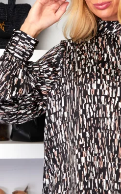 Turn heads with this Abstract Printed High Neck Satin Blouse in Black by Angeleye. This high neck top has a simple yet elegant silhouette that flatters all shapes and sizes and the gorgeous printed material is to die for. Great tucked in a pair of skinny jeans or skirt and versatile enough to be worn at the office, nights out, or at any parties.
