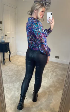 The Long Sleeve Buttoned Satin Shirt in Chic Boho Print by AngeleyeΒ is so stunning thanks to the ornate print and the glossy silk-satin fabric! Coming in a new chic print featuring wide cuffs and gold buttons throughout. Match with a pair of trendy leather trousers or your favourite jeans to complete your look.
