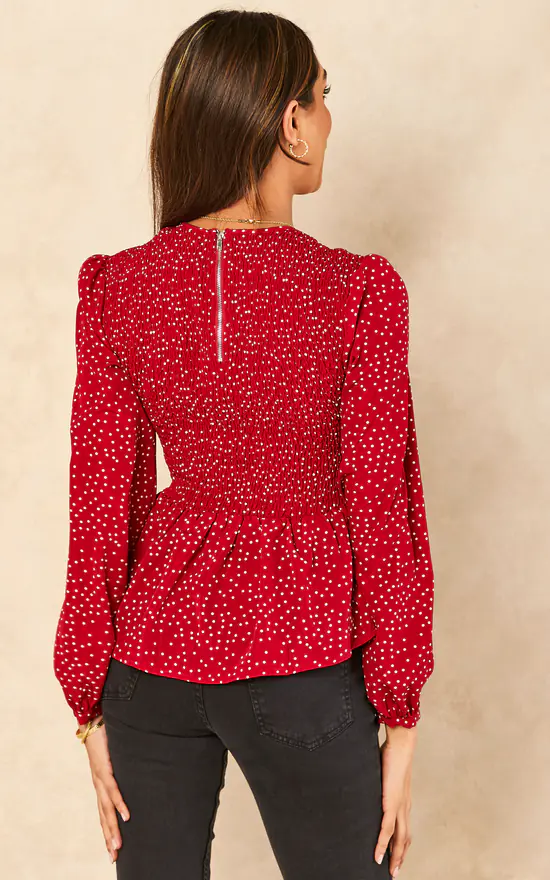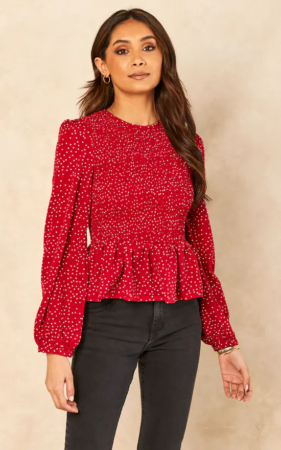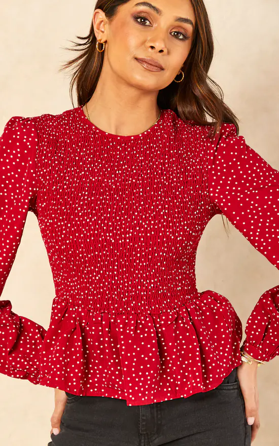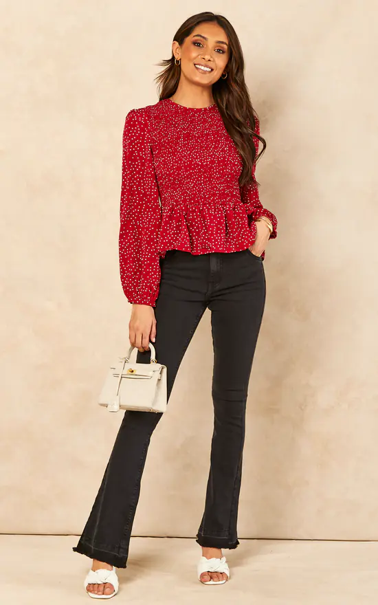 This Long Sleeve Peplum Blouse Polka Dot in Red by Angeleye is perfect for a stylish office look. Pair with wide leg trousers for a formal look or if you’re looking for evening wear pair with skinny jeans and your favourite pair of heels!