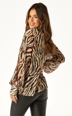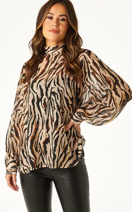 Turn heads with this Zebra High Neck Chiffon Blouse in Beige with Gold by Angeleye. This high neck top has a simple yet elegant silhouette that flatters all shapes and sizes and the gorgeous print material is to die for. Great tucked in a pair of skinny jeans or skirt and versatile enough to be worn at the office, nights out, Christmas outfit, or at any parties.