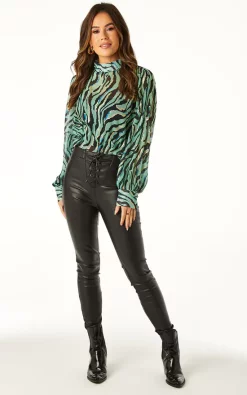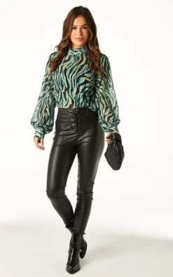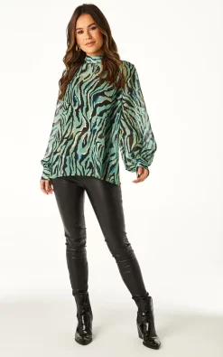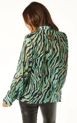 Turn heads with this Zebra High Neck Chiffon Blouse in Turquoise with Gold by Angeleye. This high neck top has a simple yet elegant silhouette that flatters all shapes and sizes and the gorgeous print material is to die for. Great tucked in a pair of skinny jeans or skirt and versatile enough to be worn at the office, nights out, Christmas outfit, or at any parties.
