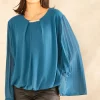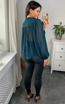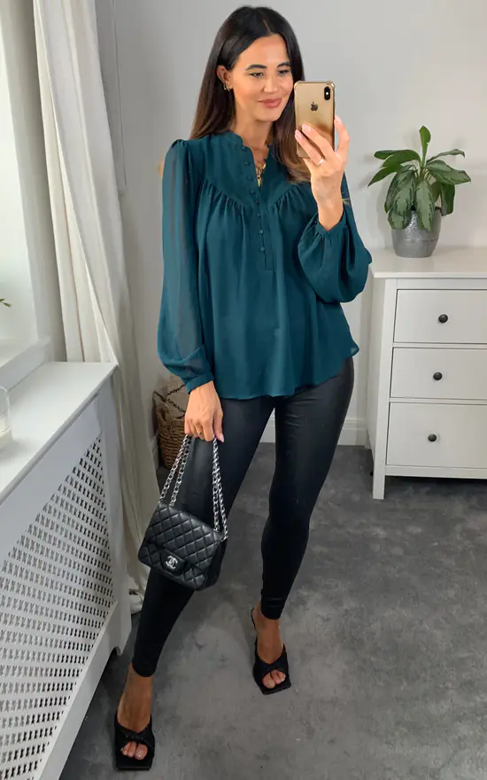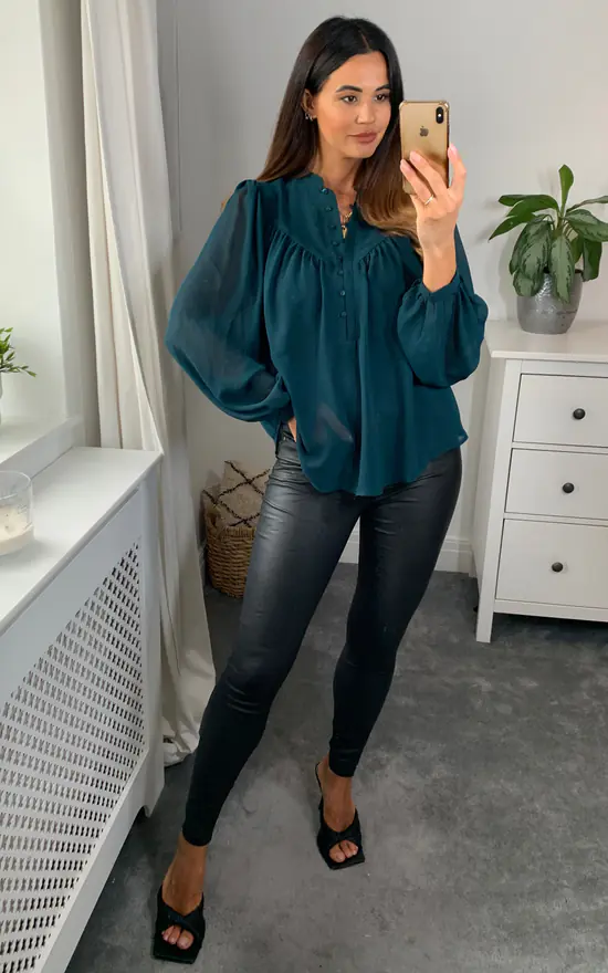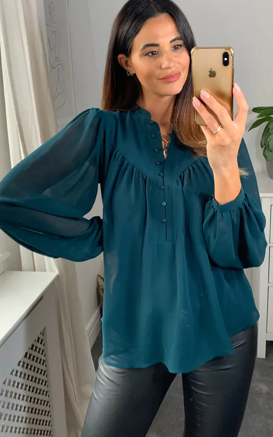 In a rich, saturated green hue, and featuring a button up V-neck and a ruched yoke design, this long sleeves blouse will add dimension to any outfit. Layer under a sharp blazer for work or under cosy knits for the weekend.