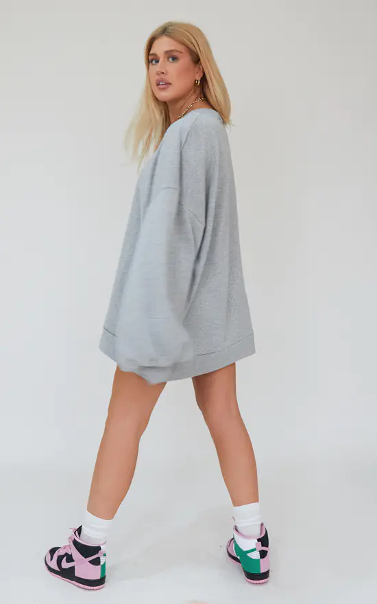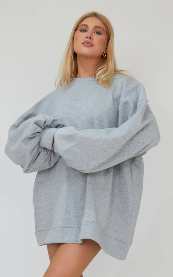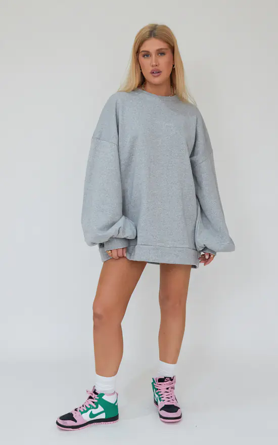 Featuring in our summer collection is this timeless oversized jumper dress, which comes with dramatic balloon sleeves for added style. Made with a roomy hem, perfect for those summer nights. Embroidered with our new season logo, this is a piece you can easily dress up or dress down for those chilled days. Coming in colours: khaki, navy, ecru, grey and black
