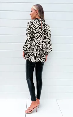 This is our Black And Stone Printed Long Sleeve High Neck Blouse, with long sleeves, elasticated cuffs and ruffle detail high neck. Complete this look with a pair of jeans or leather looks.