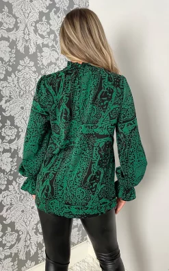 This is our Green Printed Elasticated High Neck Long Sleeve Top with elasticated cuffs. This long sleeve style will look perfect with a pair of jeans or leather looks.