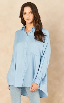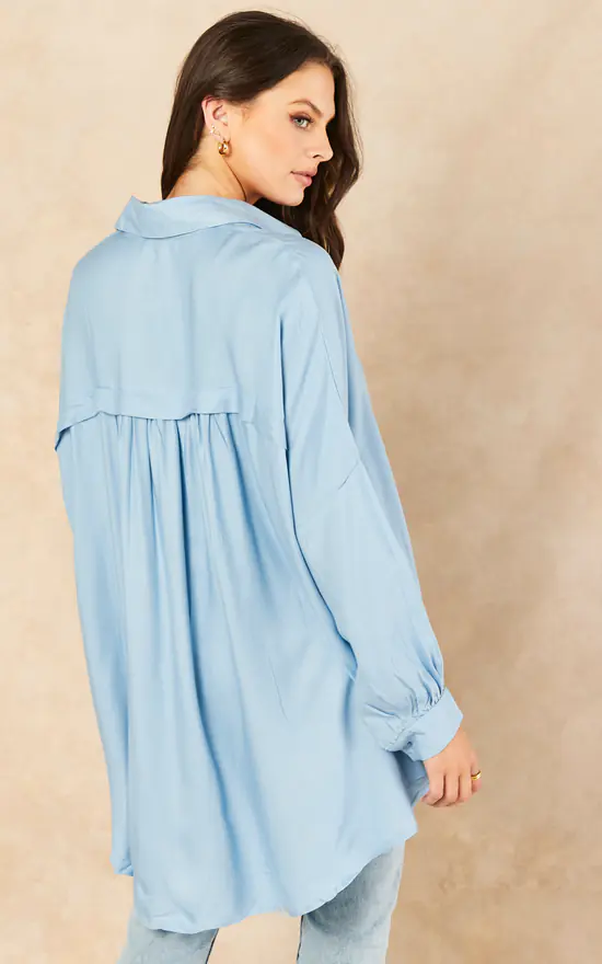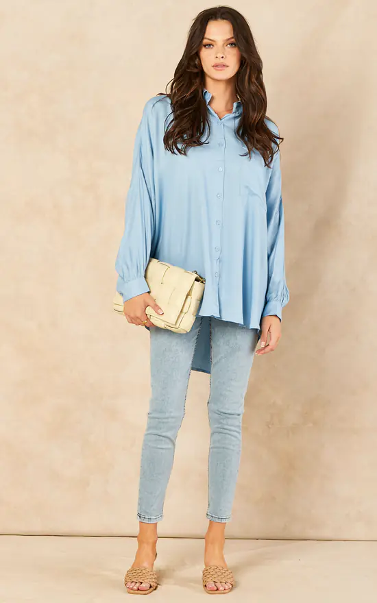 Introducing the Ariyah Oversized Shirt In Blue. A plain, button front, long sleeve shirt that is ideal to wear to your workplace. Simply match this top with trousers and short heel shoes for a fashionable yet professional look.