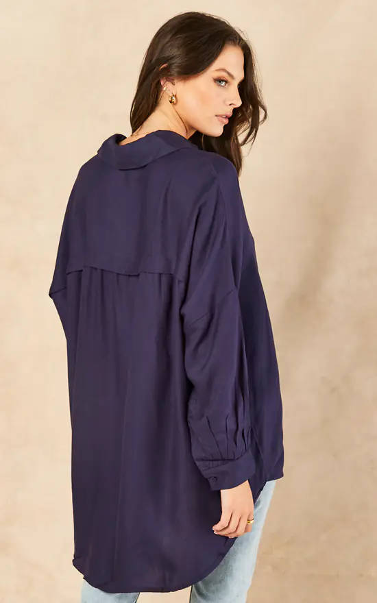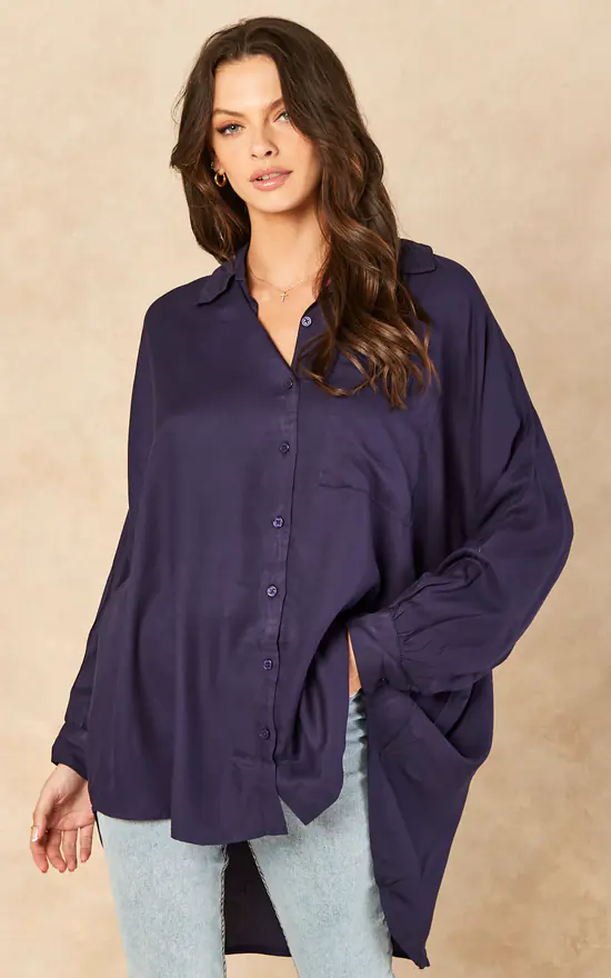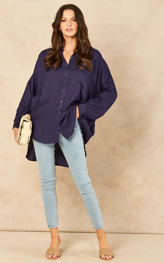 Introducing the Ariyah Oversized Shirt In Navy. A plain, button front, long sleeve shirt that is ideal to wear to your workplace. Simply match this top with trousers and short heel shoes for a fashionable yet professional look.