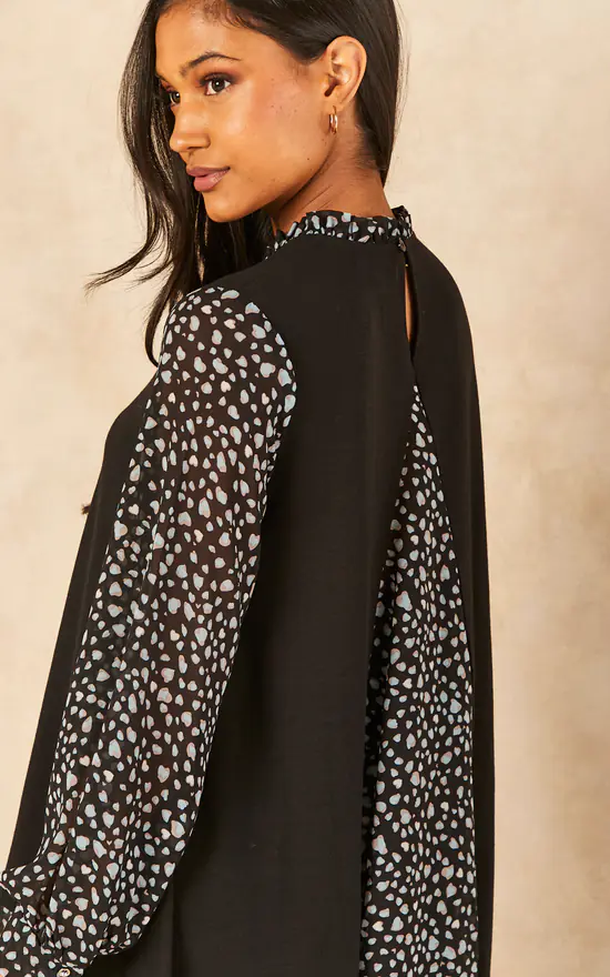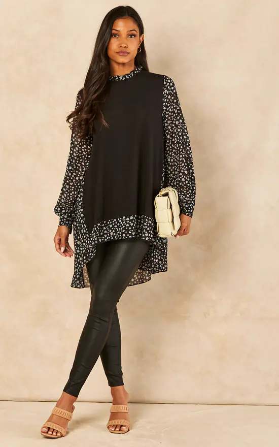 Doesn’t matter if you are going to work or a late-night cocktail with friends, you will not go wrong with the Chiffon 2 In 1 Cut & Sew Batwing Top. With a printed lace detail and a high neck, you can match this top with wide leg jeans and short heel boots.
