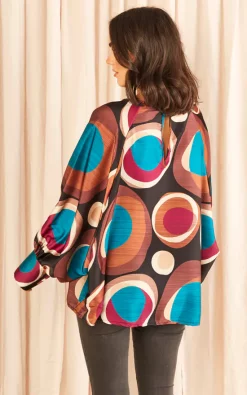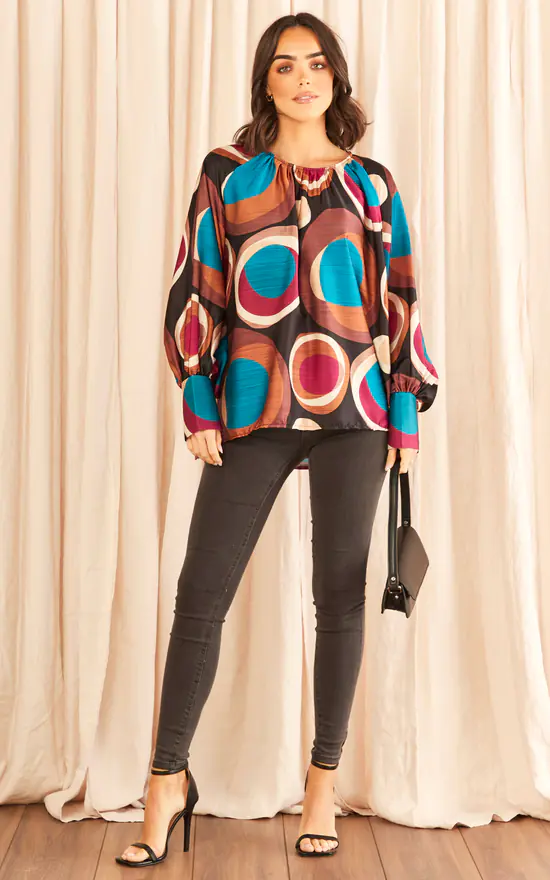 Geo Prints are here to stay! This adorable top with button cuffs, a round neckline, and an oversized design is everything you need to look yet cute and put together at the same time. We love the idea of styling this blouse with skinny jeans and high heels when going out on a city break. What about you?