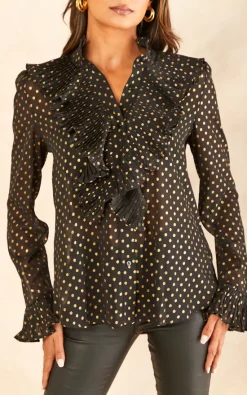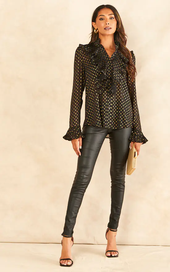 Enjoy a fun event or night out with this frill top. It has a polka dot print, button front and a see through style. Get the perfect evening look by styling shirt with white wide leg jeans and peep toe high heels.