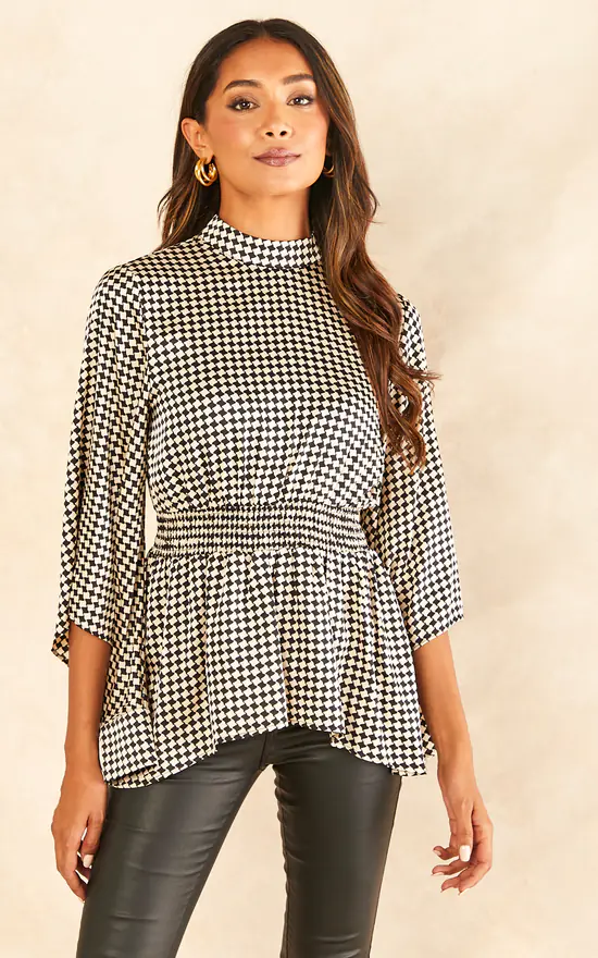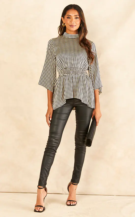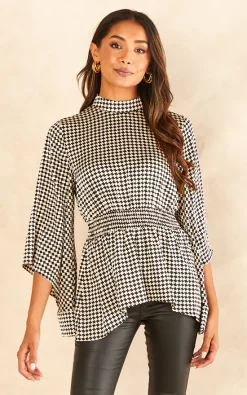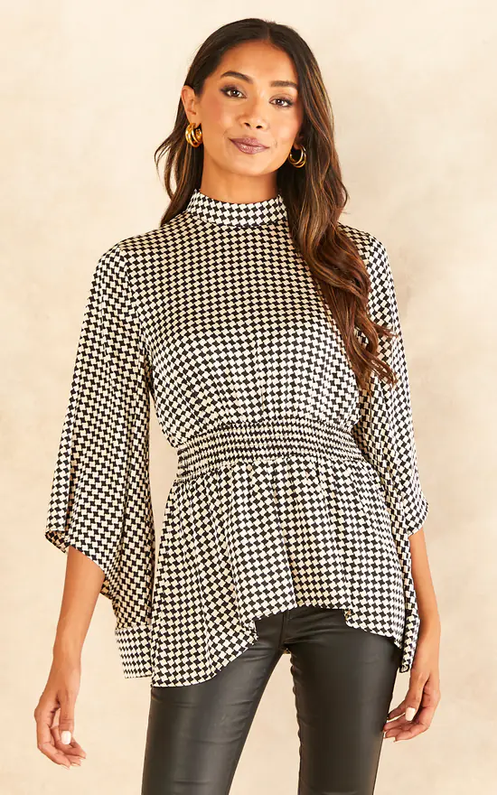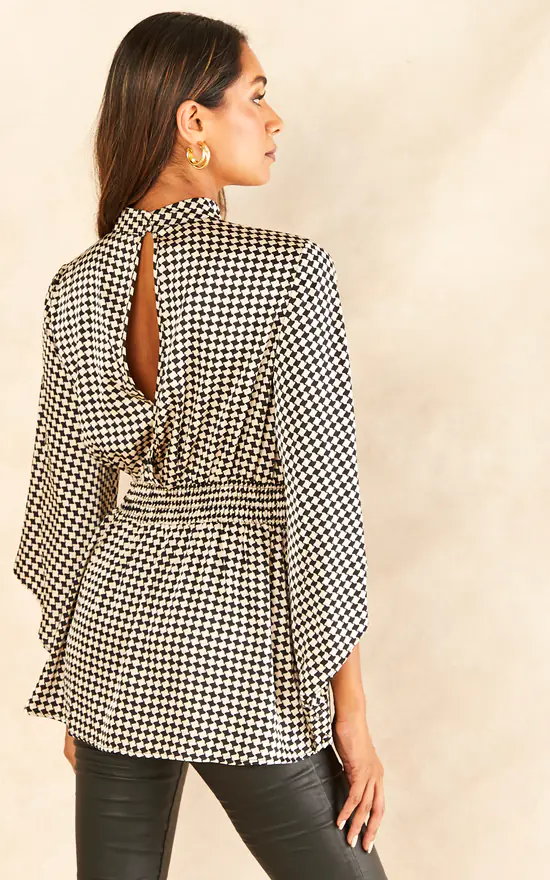 Stay stylish even at you workplace with the Houndstooth Shirred Peplum Cut Out Sleeve Top. With a back keyhole, a high neckline and shirred waist, this top can be greatly matched with black trousers and stilettos.
