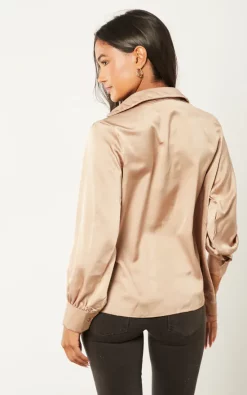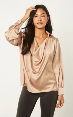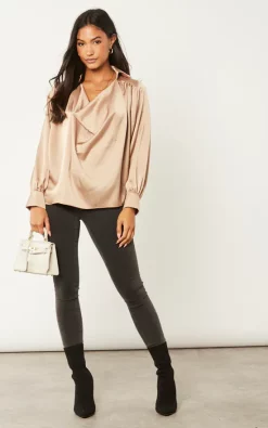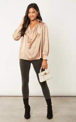 Escape the winter in our satin top! Featuring a flattering oversized fit and cowl neck this champagne blouse is perfect for busy day in office – pair with skinny leg trousers and chunky boots.