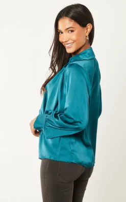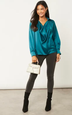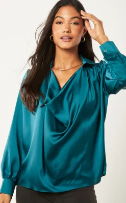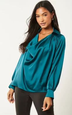 Escape the winter in our satin top! Featuring a flattering oversized fit and cowl neck this blouse is perfect for busy day in office – pair with skinny leg trousers and chunky boots.