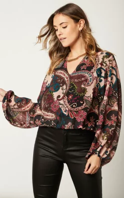 Our Paisley Bubble Hem Blouse In Black is made with fabrics that make this top both durable and stretchy. Whilst its inner layer has a soft feeling to the touch, it’s outer layer has a mesh-like feeling, which thoroughly complements it see-through style and paisley print. And thanks to its elasticated waistline and cuffs, comfort is assured in this top. Take advantage of the v neckline to show off a minimalist necklace, and then complete the style with high waisted jeans and ankle boots.