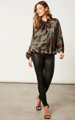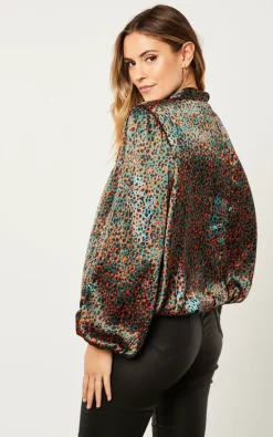 Step up your game this season with this gorgeous high neck top. It features a pussy bow, adorable long puff sleeves, an abstract print, elasticated cuffs and waistline, and a satin like feeling fabric. Create a glamourous evening look by combining this top with black flare trousers and Cuban heel boots.