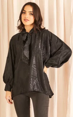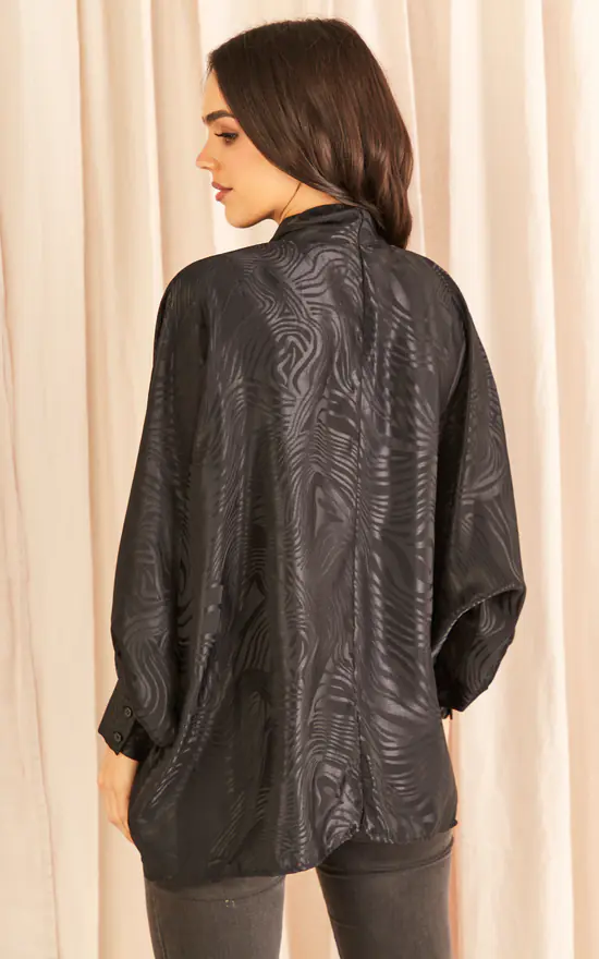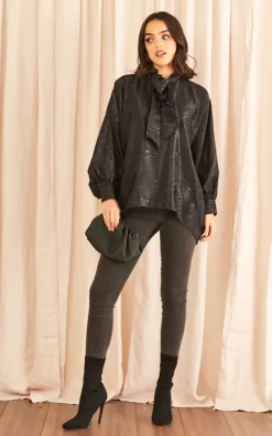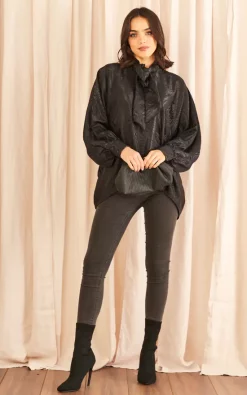 Oh so great to have a top that you can wear both at work and later in the evening when going out for cocktails. This oversized black top has a front bow and a wonderful satin feeling to it. Grab yourself a pair of white high waisted jeans, and tuck in the front part of your blouse. Then, finish of your look with cut out heeled sandals and a tote bag.
