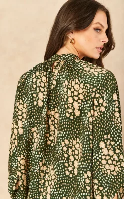 Meet Blue Vanilla’s Raglan Cut Out Sleeve Volume Top In Green. Prints, a high neck and puff sleeves, this top has all the elements that make fall a lovely season! When paired with ankle boots and white trousers, this top is ideal for the workplace and later on for casual drinks with your friends.