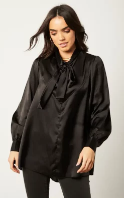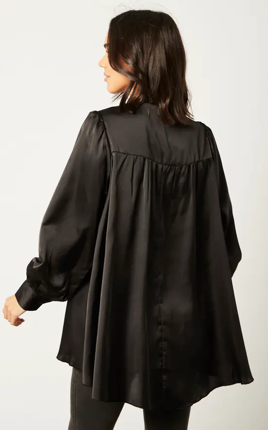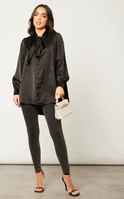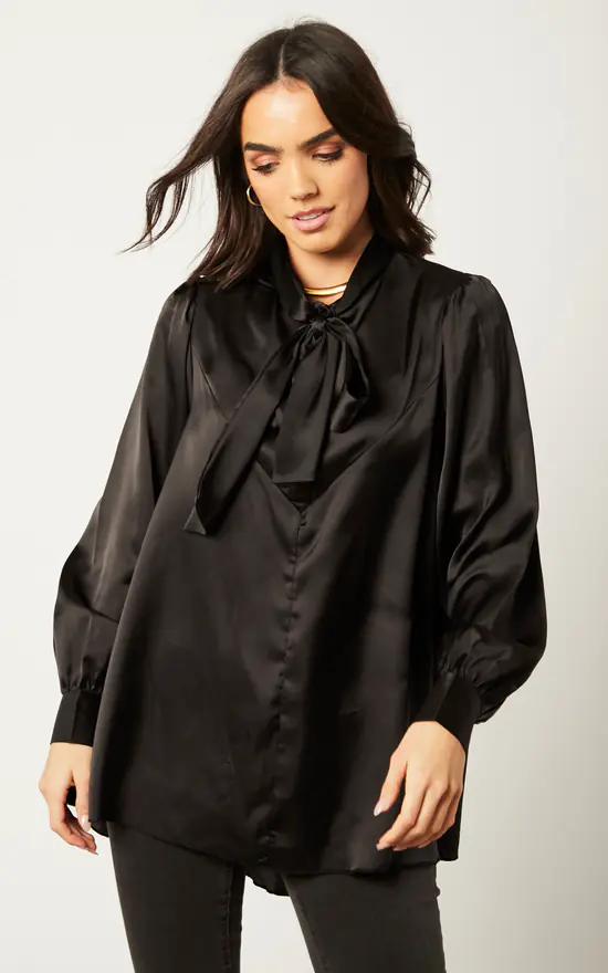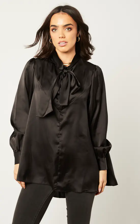 A classy, timeless fashion staple – the plain oversized satin black shirt that goes well with anything you want. Add a little bow to it, a button front, and a back detail, and make it even more eye-catching. With belted trousers and flat shoes, this outfit isn’t just about looking fashionable. It’s about looking and feeling your best anywhere you go!