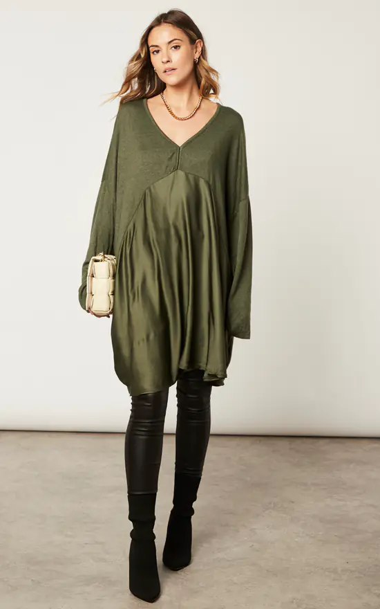 Escape the winter in our satin insert top! Featuring a flattering oversized fit, this top is perfect for time free with your family – pair with wide leg trousers and comfy boots.