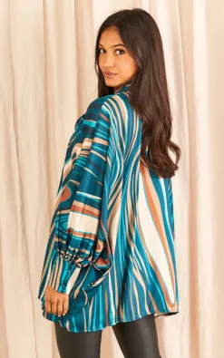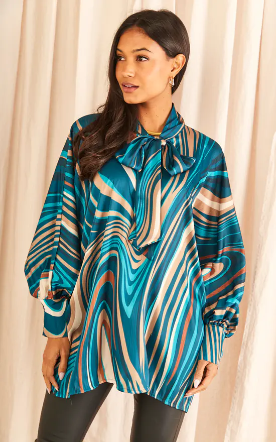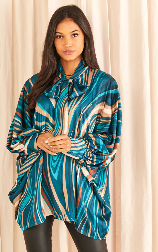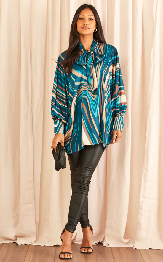 Look in the mirror. What do you see? A beautiful woman wearing an elegant top with a vibrant pattern, satin feeling, a neck tie, and a gorgeous teal colour. When worn with leather leggings and ankle strap heels, this top can take you from work, to dinner parties, to relaxing evenings out with friends!