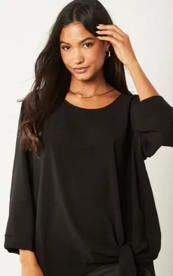 Casual-Smart is what we live for. This top black features a tie knot side, round neckline and long sleeves. Wear a pencil skirt and heels for a glam professional look, or swap the pencil skirt for our own Blue Vanilla High Waisted Satin Trousers, and enjoy a cocktail with friends!