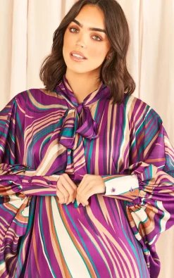 Look in the mirror. What do you see? A beautiful woman wearing an elegant top with a vibrant pattern, satin feeling, a neck tie, and a gorgeous purple colour. When worn with leather leggings and ankle strap heels, this top can take you from work, to dinner parties, to relaxing evenings out with friends!