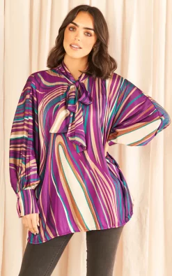 Look in the mirror. What do you see? A beautiful woman wearing an elegant top with a vibrant pattern, satin feeling, a neck tie, and a gorgeous purple colour. When worn with leather leggings and ankle strap heels, this top can take you from work, to dinner parties, to relaxing evenings out with friends!