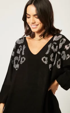 Add a little fun to your wardrobe with this black leopard print, v neck knit jumper! Style with a leather skirt and ankle boots. Then, take your style a little further by finishing off with minimal jewellery. Perfect for a night out, right? ๐