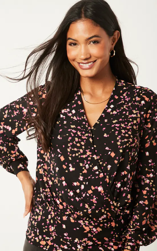 Going on a date night and need something that is both stylish and warm? Meet the Wrap Front Deep Hem Band Top. With a v neckline, wrap design and a beautiful pattern, match this top with a mid length skirt and heeled boots for an elegant look.