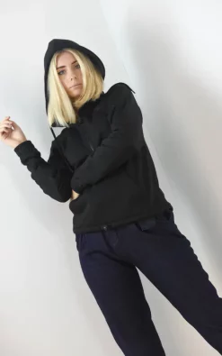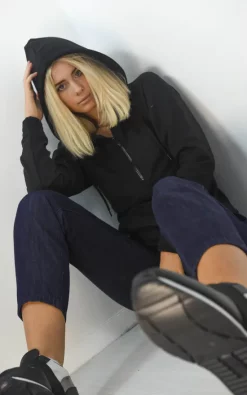 High quality black soft cotton hoodie jumper top with a front pocket and zip up funnel neck collar. A comfortable fit with an adjustable drawstring hem, perfect for the autumn/winter season. Pair this hoodie with our matching joggers for a comfy coordinating set outfit!