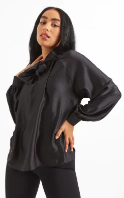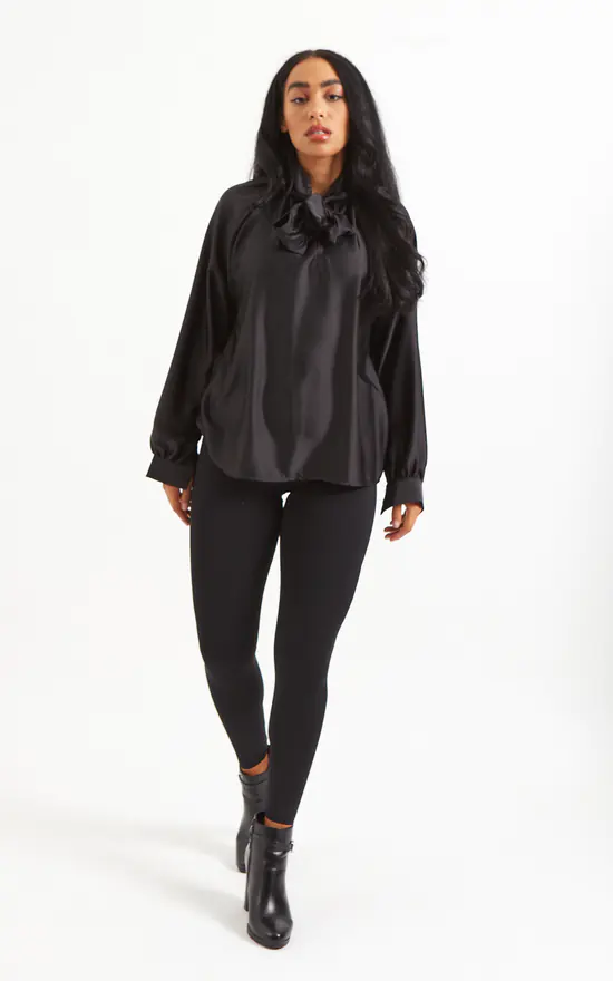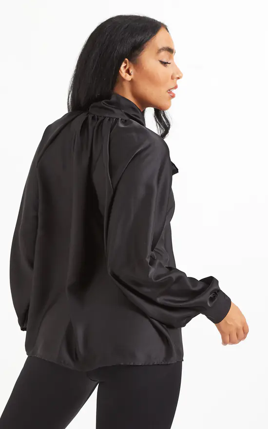 Our Black Satin Feel Tie Neck Blouse is part of our latest Blouses collection. Featuring a thin, lightweight satin like material in a unique tie neck, v neck and cuff button.