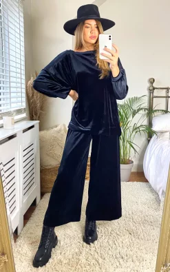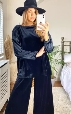 It has a slash neck, long sleeves and is made from a stretch velour fabric in plain black.