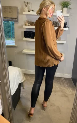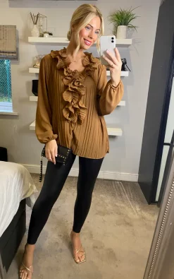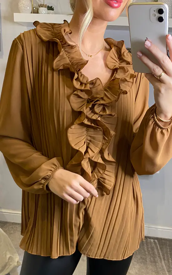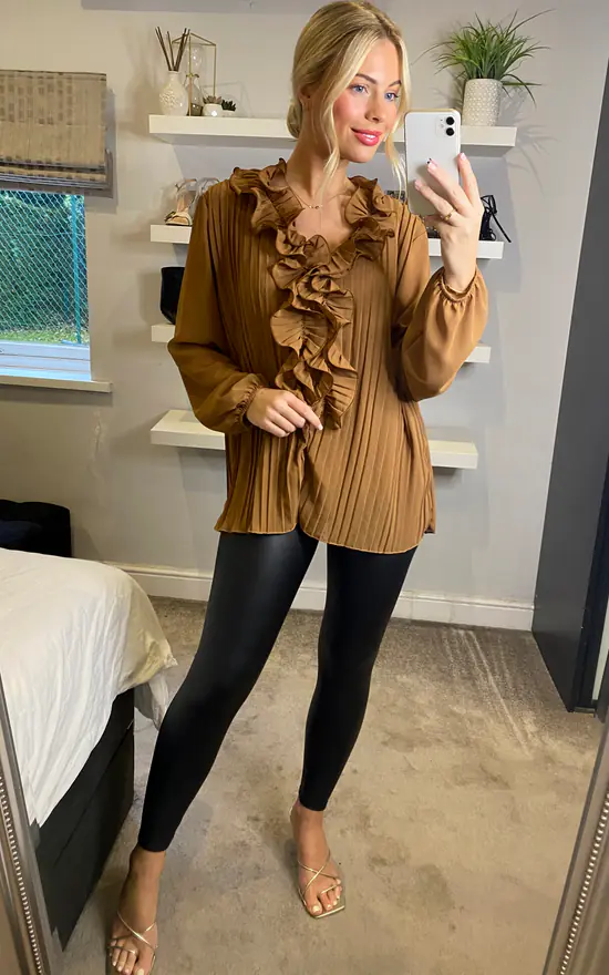 This gorgeous pleated blouse with a ruffle detail necklace is flattering yet elegant! Can be worn to work or for drinks out and can be paired with a wide range of bottoms and shoes!