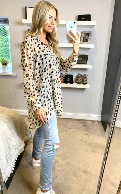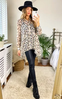 Gorgeous printed blouse with a lurex spot running through it, and gold buttons. Perfect with a pair of leather jeans, we love the longer length and hi lo hem making it super flattering for all shapes, a definite wardrobe staple.