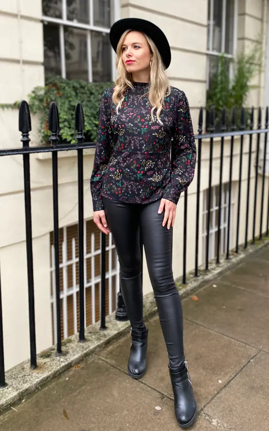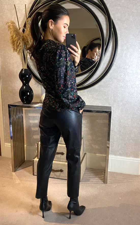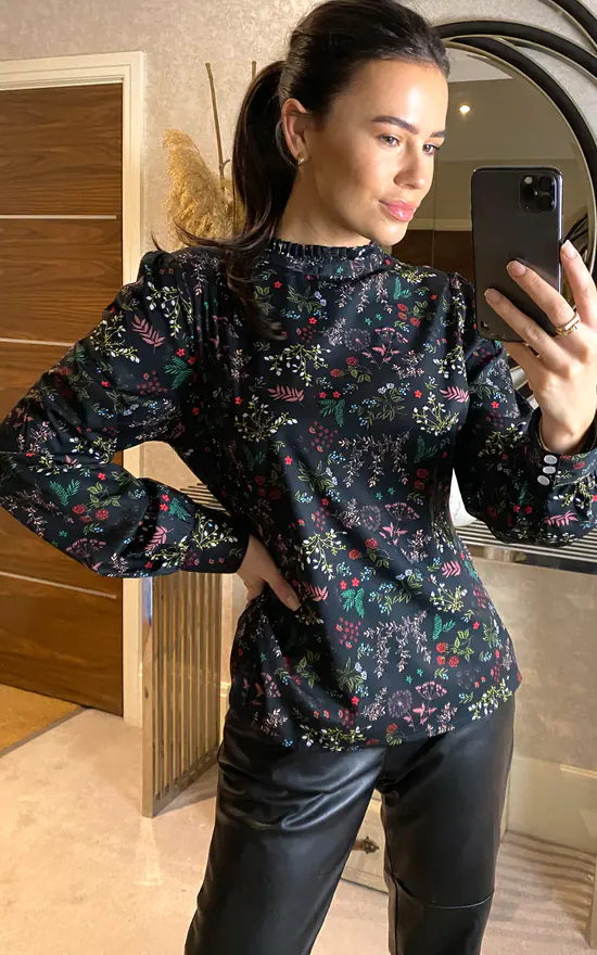 Gorgeous long sleeve blouse featuring floral print details. Perfect blouse for your nice top and a jeans look, really easy to style. Ruffle detailed high-neck and long sleeves with elegant details makes the top very versatile. Throw on with jeans and sneakers for a day look or wear it with high heels and black jeans for a charming evening look or a date night.
