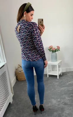 Gorgeous long sleeve blouse featuring floral print details. Perfect blouse for your nice top and a jeans look, really easy to style. Ruffle detailed high-neck and long sleeves with elegant details makes the top very versatile. Throw on with jeans and sneakers for a day look or wear it with high heels and black jeans for a charming evening look or a date night. The top is made with soft viscose fabric great for all year around.