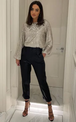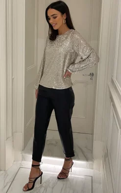 The party-perfect sequin blouse in silver features a long sleeve. Turn all eyes on you with this super easy-to-style luxurious chic sequin blouse. The top has been lined with super comfy stretchable fabric for extra comfort. Long flowy sleeves with an elasticated hem makes the top very flattering. Wear it with coated jeans, boots and leather jacket for a smart look or wear it with heels, clutch and statement earrings and you are ready to rock the party.