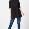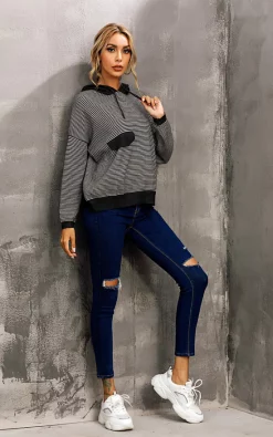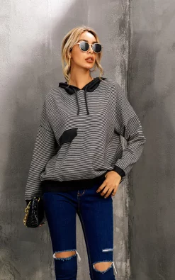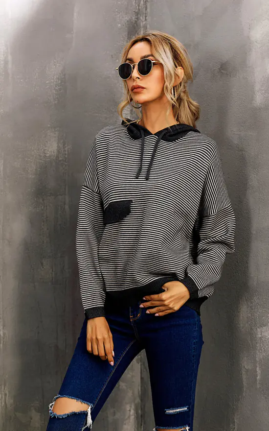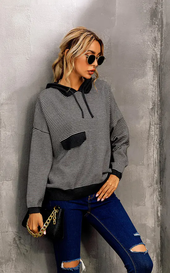 Hoodie Jumper Top In Charcoal Black With White Striped