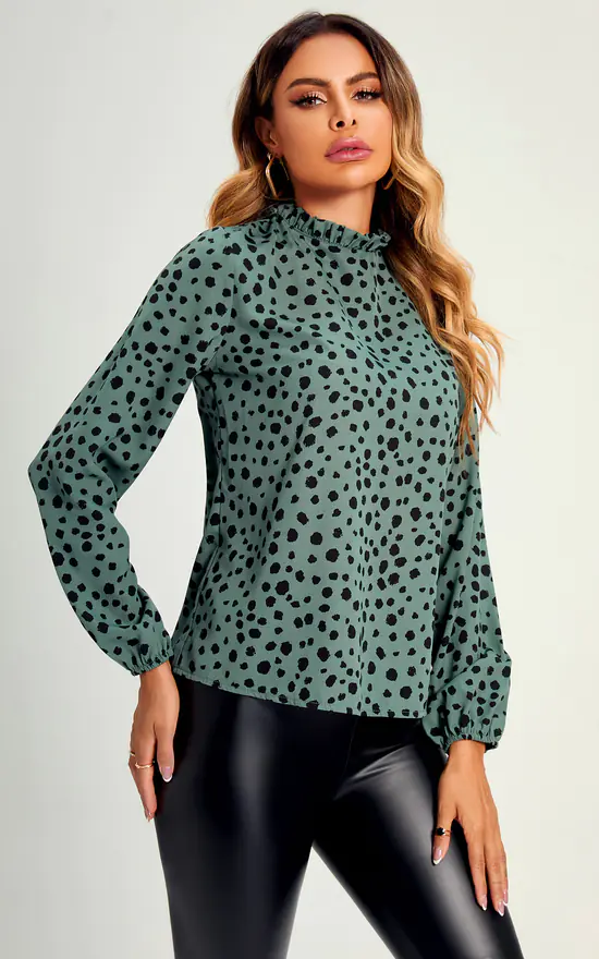 Leopard Print Frill Detail High Neck Top/Blouse In Green