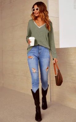 Long Sleeves Silver Trim Simple Style T Shirt Top In Olive Green