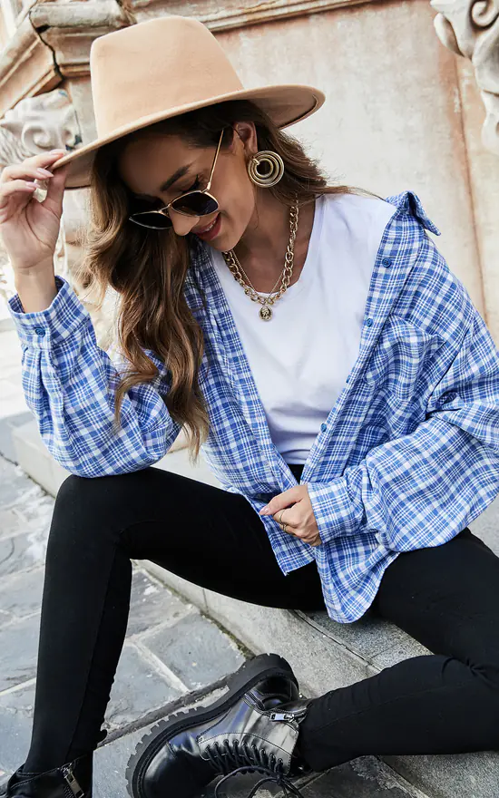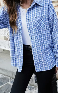 Oversized White Brushed Check Pocket Detail Shirt In Blue