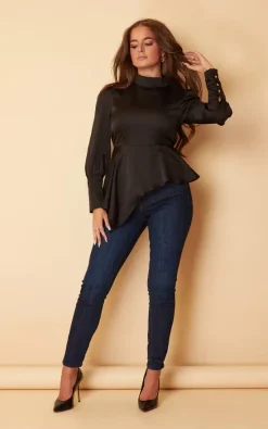This stunning Black Top oozes sophistication with its asymmetrical cut and high neck. Pair with trousers and heels to complete the look.