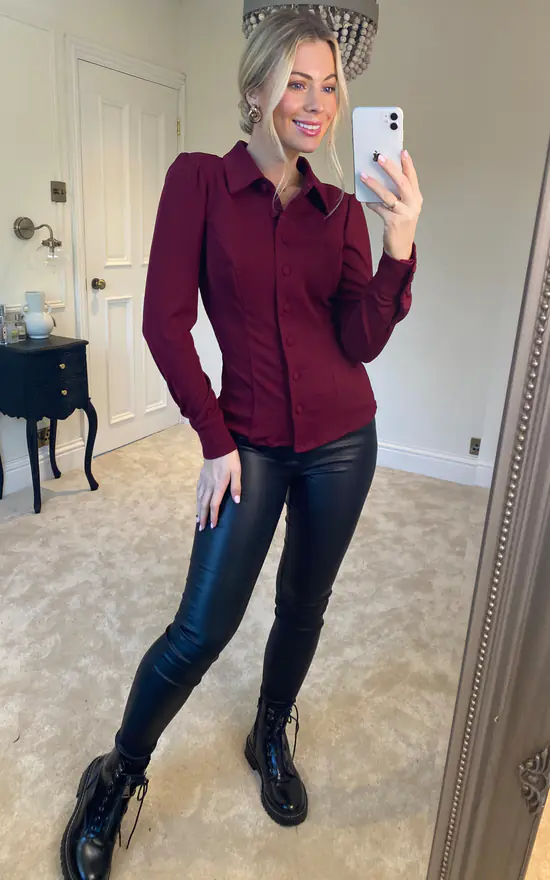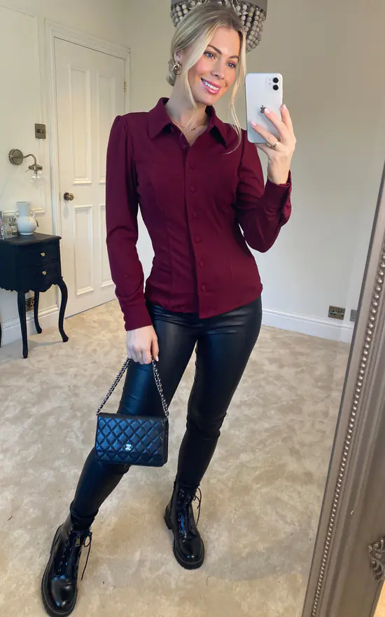Beautiful in burgundy, our brand-new Frida top is a perfect go to piece for the winter season. Made using a super stretchy fabric in a deep burgundy colour, featuring functional front buttons to create an easy to wear relaxed shirt. The gathered full sleeves detail a sweet cuff with a keyhole and three button closure. The classic shirt collar balances the princess seams perfectly, emphasising that relaxed shirting look. Easy to pair with our Louisa check swing skirt or a pair of jeans, this shirt is multi-functional. Style it your way.