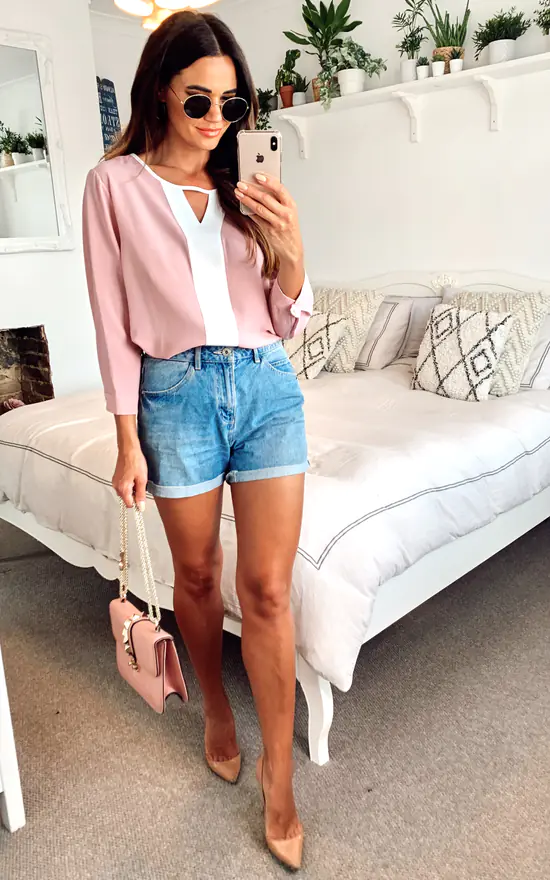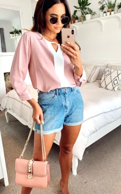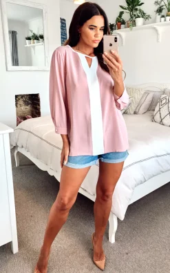 3/4 Sleeve Oversized V Neck Top with Line in Pink